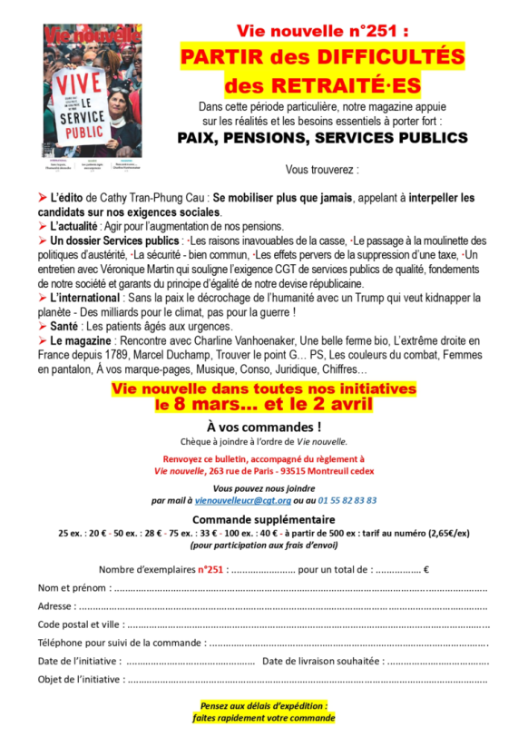Avec ce numéro de Vie Nouvelle c'est l'occasion de sensibiliser les retraité.e.s qui constatent aujourd'hui l'amputation de leurs revenus par la hausse de la CSG et de les gagner à participer de plus nombrex.ses aux initiatives revendicatives à venir.